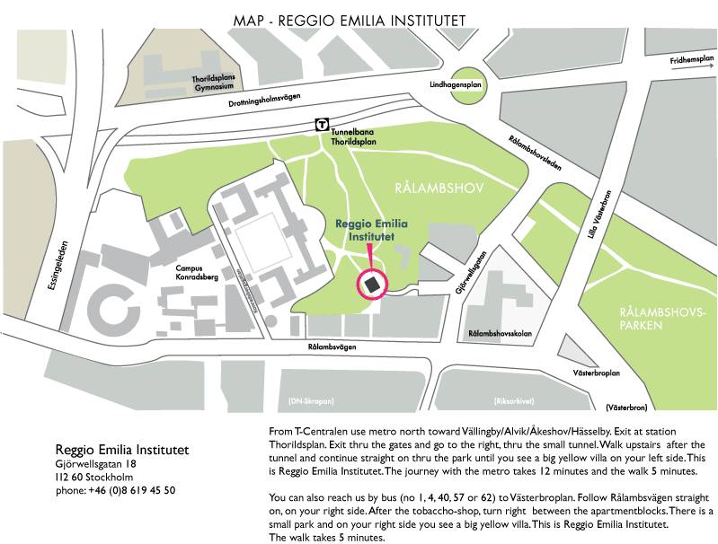 From Central Station take the metro (green line) north towards Vällingby / Alvik / Åkeshov / Hässelby. Get off at the station Thorildsplan. Walk out the latches and turn right, through the small tunnel. Go up the stairs after the tunnel and continue straight ahead, through the park, until you see a big yellow house on the left side. It’s Reggio Emilia Institute.