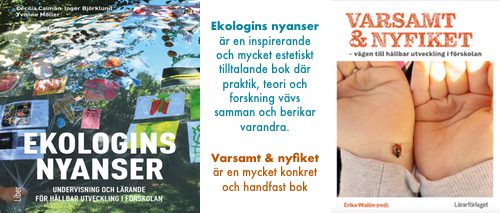 Cecilia Caimans, Inger Björklunds och Yvonne Möllers Ekologins nyanser. Undervisning och lärande för hållbar utveckling i förskolan (Liber) är en inspirerande och mycket estetiskt tilltalande bok där praktik, teori och forskning vävs samman och berikar varandra genom ett nära samarbete mellan styrkedjans olika nivåer och roller; barnen, arbetslaget, ledningen och forskningen. I detta växelspel står lärande i ekologi och hållbar utveckling i fokus genom utforskande undervisning och med didaktikens huvudfrågor som grund.